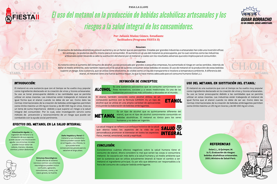 In Puerto Rico, 1 in 3 fatalities on public roads involves a drunk driver and each event like this a family immersed in pain for having lost a loved one in an unexpected way and under such tragic circumstances. As part of the efforts to educate our community and carry the message of prevention of drivers under the influence of intoxicating beverages, this poster seeks to define the basic concepts related to traffic crashes caused by drunk drivers; describe the penalties that apply to drunk drivers according to chapter 7 of Law 22-2000; and review cases of fatal victims of crashes caused by drunk drivers.